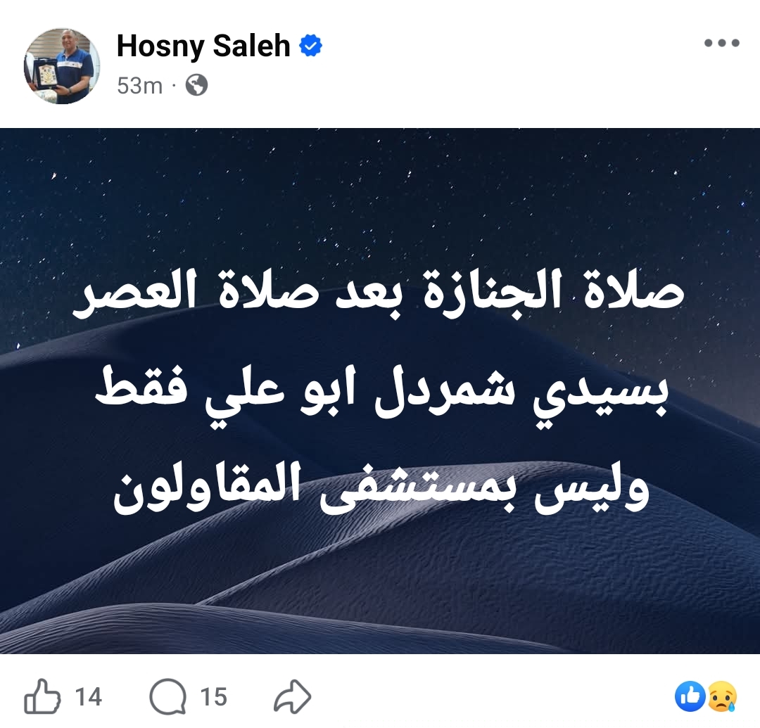 وكتب حسني صالح عبر صفحته قائلًا: "صلاة الجنازة بعد صلاة العصر بسيدي شمردل أبو علي فقط وليس بمستشفى المقاولون.