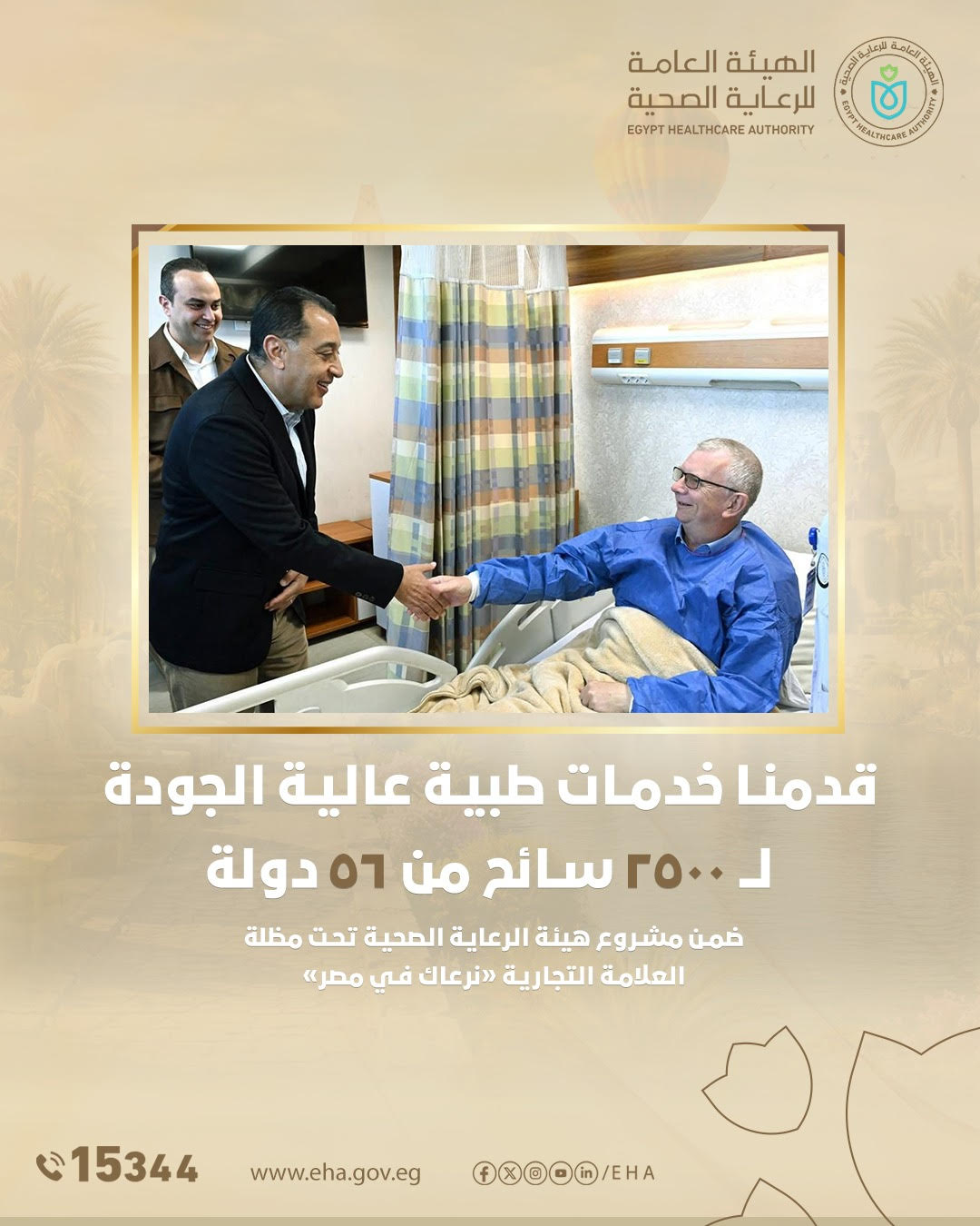 كما أبرز الإنفوجراف دور الهيئة في دعم السياحة العلاجية، حيث تم تقديم خدمات طبية عالية الجودة لـ 2500 سائح من 56 دولة تحت مظلة العلامة التجارية «نرعاك في مصر»، فضلًا عن الدور المحوري لـ مجمع الأقصر الطبي الدولي باعتباره أيقونة الرعاية الصحية في الصعيد، بعد تقديمه 1.6 مليون خدمة طبية، وإجراء أكثر من 34 ألف عملية جراحية داخل 11 غرفة عمليات مجهزة بأحدث التقنيات.