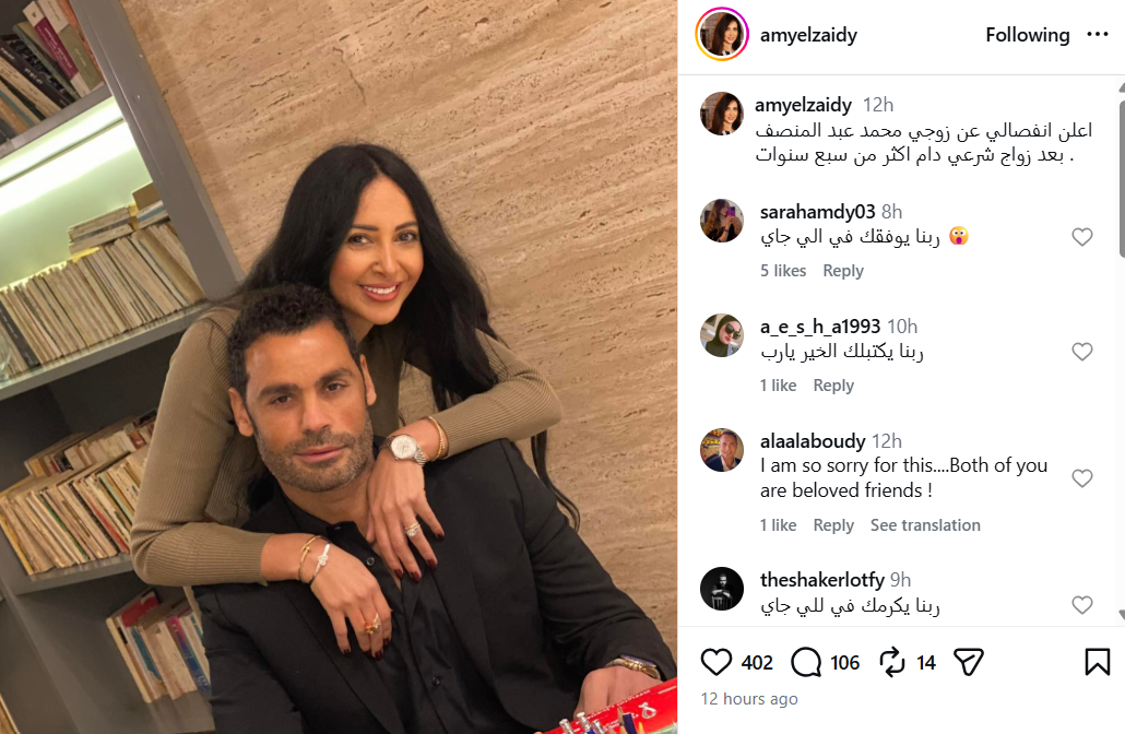 وفاجأت الممثلة إيمان الزيدي الجميع بالإعلان عن انفصالها عن زوج النجمة لقاء الخميسي، محمد عبدالمنصف، لاعب نادي الزمالك ومنتخب مصر السابق، وذلك خلال منشور عبر حسابها الشخصي بموقع التواصل الاجتماعي الأشهر “فيس بوك”.