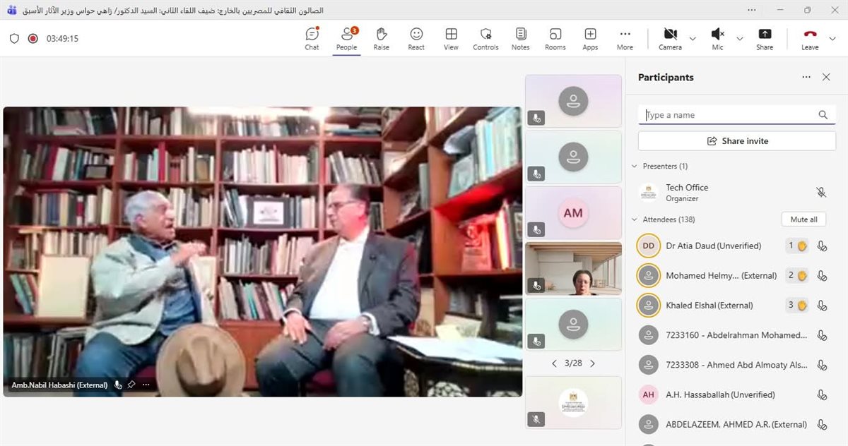 استضاف السفير نبيل حبشي، نائب وزير الخارجية للهجرة وشئون المصريين بالخارج، الدكتور زاهي حواس، وزير الآثار الأسبق، وذلك في اللقاء الثاني للصالون الثقافي للمصريين بالخارج. ويأتي هذا اللقاء في إطار المبادرة التي افتتحها الدكتور بدر عبد العاطي، وزير الخارجية والهجرة وشئون المصريين بالخارج، خلال اللقاء الأول للصالون، والذي يُعد مسارًا جديدًا للتواصل مع المصريين في الخارج، وملتقى فكريًا وثقافيًا واجتماعيًا تُطل من خلاله الشخصيات البارزة والمثقفة لإطلاع أبناء الوطن بالخارج على أبرز التطورات الثقافية التي تشهدها الدولة المصرية.