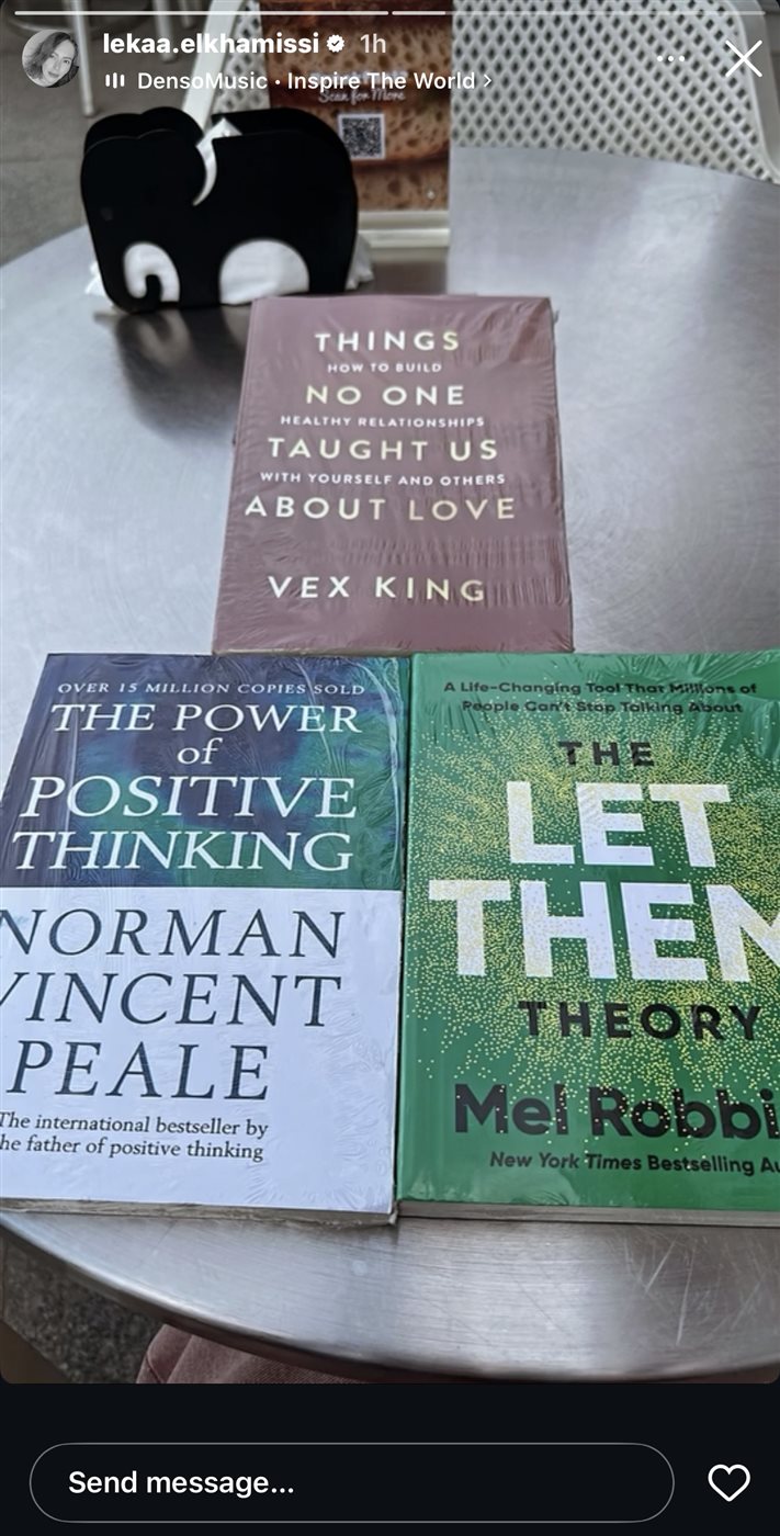 نشرت لقاء الخميسي صور لمجموعة من الكتب عن الحب والطاقة الإيجابية، استعدادًا لقراءتها لتكشف بذلك عن تجاهلها أنباء زواج زوجها من الممثلة إيمان الزيدي.
