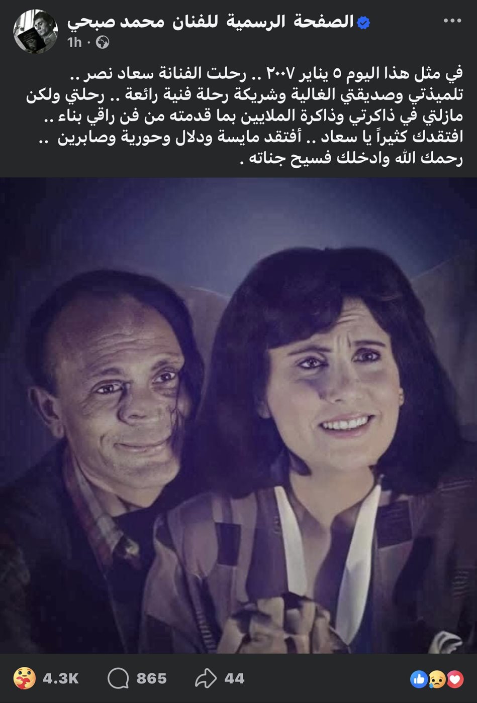 حرص النجم محمد صبحي على رثاء رفيقة رحلته الفنانة الراحلة سعاد نصر، إحياءً لذكرى وفاتها، وذلك من خلال منشور عبر حسابه الرسمي على موقع التواصل الإجتماعي الأشهر “فيسبوك”.