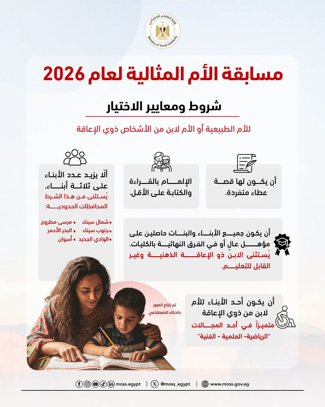 نشرت وزارة التضامن الاجتماعي، عبر صفحتها الرسمية على موقع التواصل الاجتماعي "فيسبوك" انفوجراف، توضح من خلاله شروط ومعايير اختيار الأم المثالية، حيث فتحت باب التقدم على مسابقة الأم المثالية أمس الأحد ويستمر التقديم حتى يوم الخميس الموافق ٢٢ يناير الجاري.