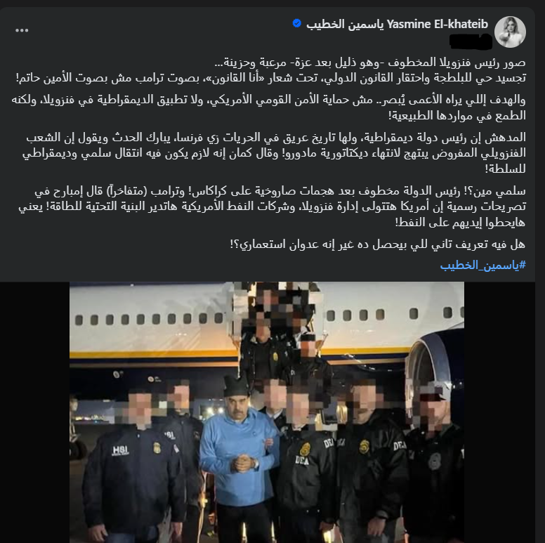 أثارت ياسمين الخطيب حالة من الجدل عبر مواقع التواصل الاجتماعي، بعدما نشرت منشورًا مطولًا على حسابها الرسمي بموقع فيسبوك، أرفقته بصورة لرئيس فنزويلا وهو مقيد، وعلّقت عليها قائلة: “صور رئيس فنزويلا المخطوف وهو ذليل بعد عزة مرعبة وحزينة”.