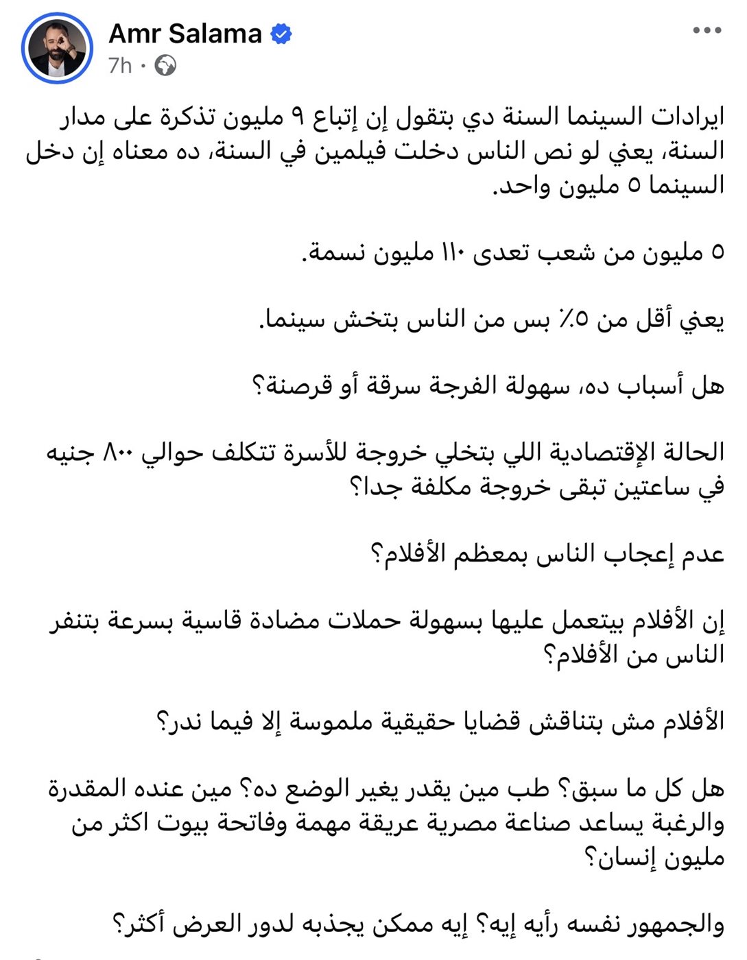 واختتم عمرو سلامة حديثه قائلًا: "مين عنده المقدرة والرغبة يساعد صناعة مصرية عريقة مهمة وفاتحة بيوت أكثر من مليون إنسان؟ والجمهور نفسه رأيه إيه؟ إيه ممكن يجذبه لدور العرض أكتر؟".