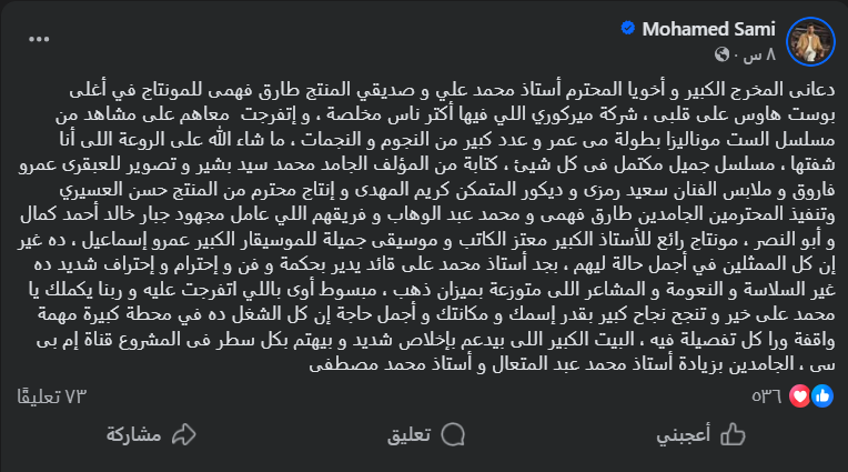 واختتم سامي منشوره بالإشادة بدعم قناة “MBC” للمسلسل، واصفًا إياها بالبيت الكبير الذي يقف خلف كل تفصيلة في المشروع، موجّهًا تحية خاصة لكل من محمد عبد المتعال ومحمد مصطفى.