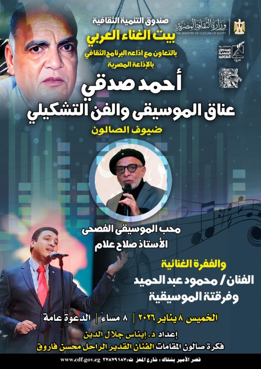 يقيم صالون مقامات بمركز إبداع بيت الغناء العربي بقصر الأمير بشتاك بشارع المعز، يوم الخميس المقبل الموافق 8 يناير 2026، صالونه الثقافي بعنوان "أحمد صدقي.. عناق الموسيقى والفن التشكيلي"، وذلك بالتعاون مع إذاعة البرنامج الثقافي بالإذاعة المصرية، في تمام الساعة الثامنة مساءً.