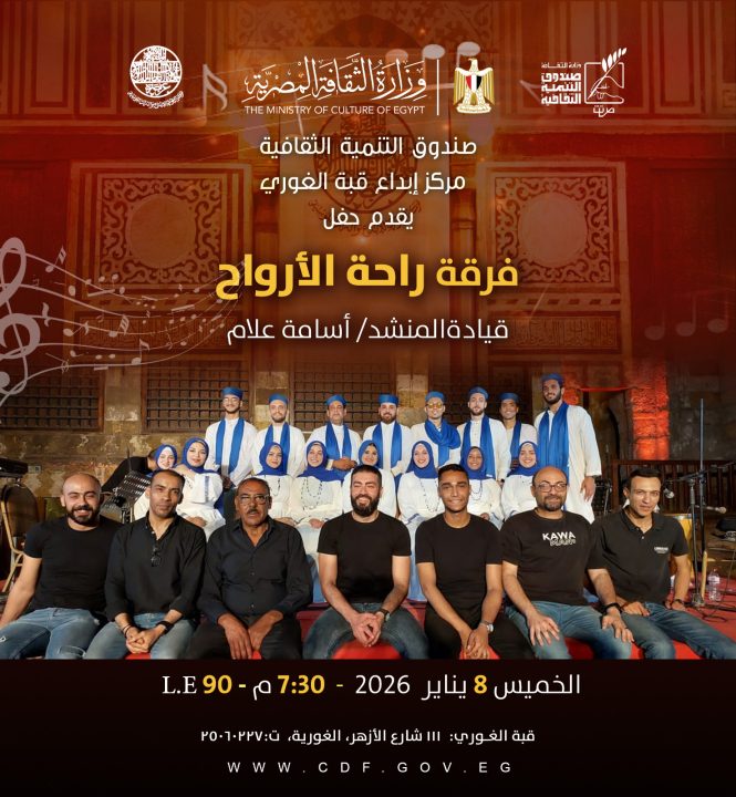 يقدّم قطاع صندوق التنمية الثقافية بوزارة الثقافة، من خلال مركز إبداع قبة الغوري بشارع الازهر، حفلًا فنيًا لفرقة راحة الأرواح، وذلك مساء الخميس المقبل الموافق 8 يناير في تمام الساعة السابعة والنصف مساءً، في إطار دعم الفنون الجادة وصون التراث الموسيقي والروحي.
