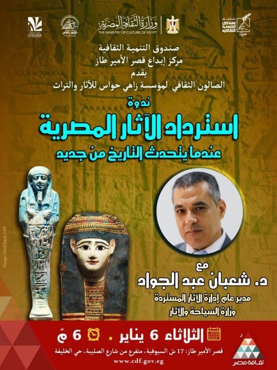 ينظم مركز إبداع قصر الأمير طاز بالسيوفية، التابع لقطاع صندوق التنمية، الليلة، ندوة ثقافية بعنوان “استرداد الآثار المصرية… عندما يتحدث التاريخ من جديد”، وذلك في تمام الساعة السادسة مساءً، بالتعاون مع الصالون الثقافي لمؤسسة زاهي حواس للآثار والتراث.