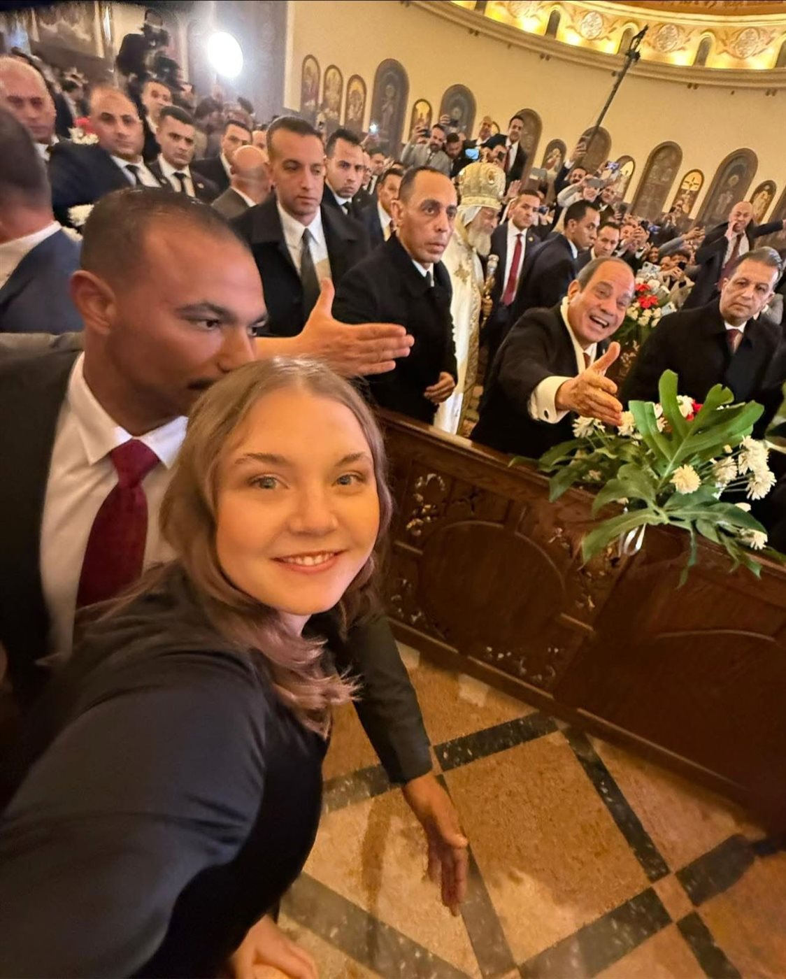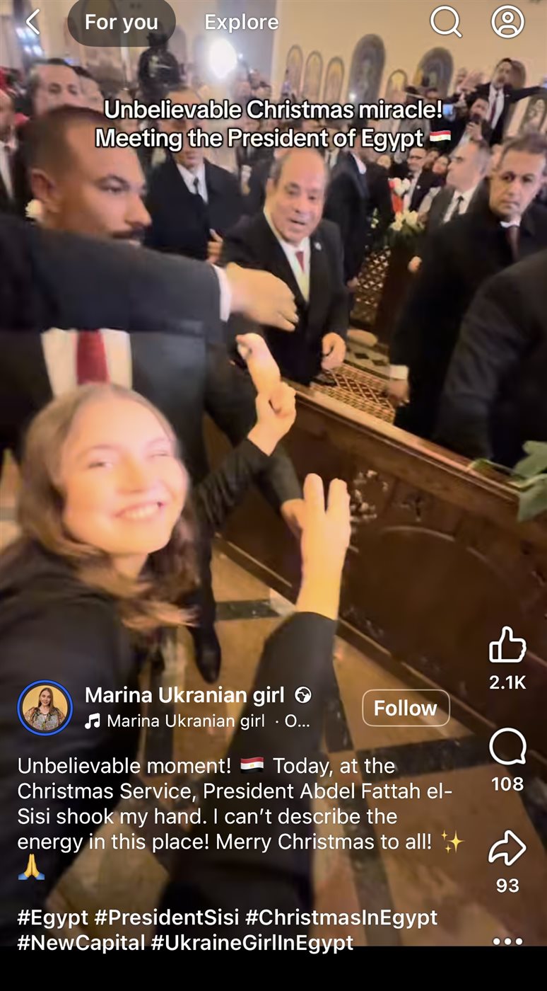 أظهرت فتاة أوكرانية تُدعى مرينا سعادتها خلال التقاطها صور مع الرئيس المصري عبد الفتاح السيسي أثناء زيارته قداس عيد الميلاد المجيد بالعاصمة الإدارية الجديدة، مُعبرة عن فخرها بكاتدرائية ميلاد المسيح ومصافحة الرئيس.