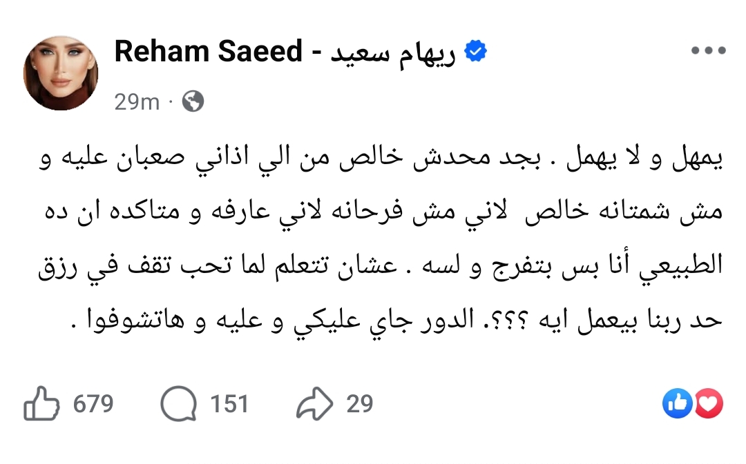 وكتبت ريهام عبر صفحتها قائلة : «يمهل ولا يهمل بجد محدش خالص من اللي آذاني صعبان عليه ومش شمتانه خالص، أنا بس بتفرج ولسه عشان تتعلم لما تحب تقف في رزق حد ربنا بيعمل إيه؟؟..الدور جاي عليكي وعليه وهاتشوفوا».