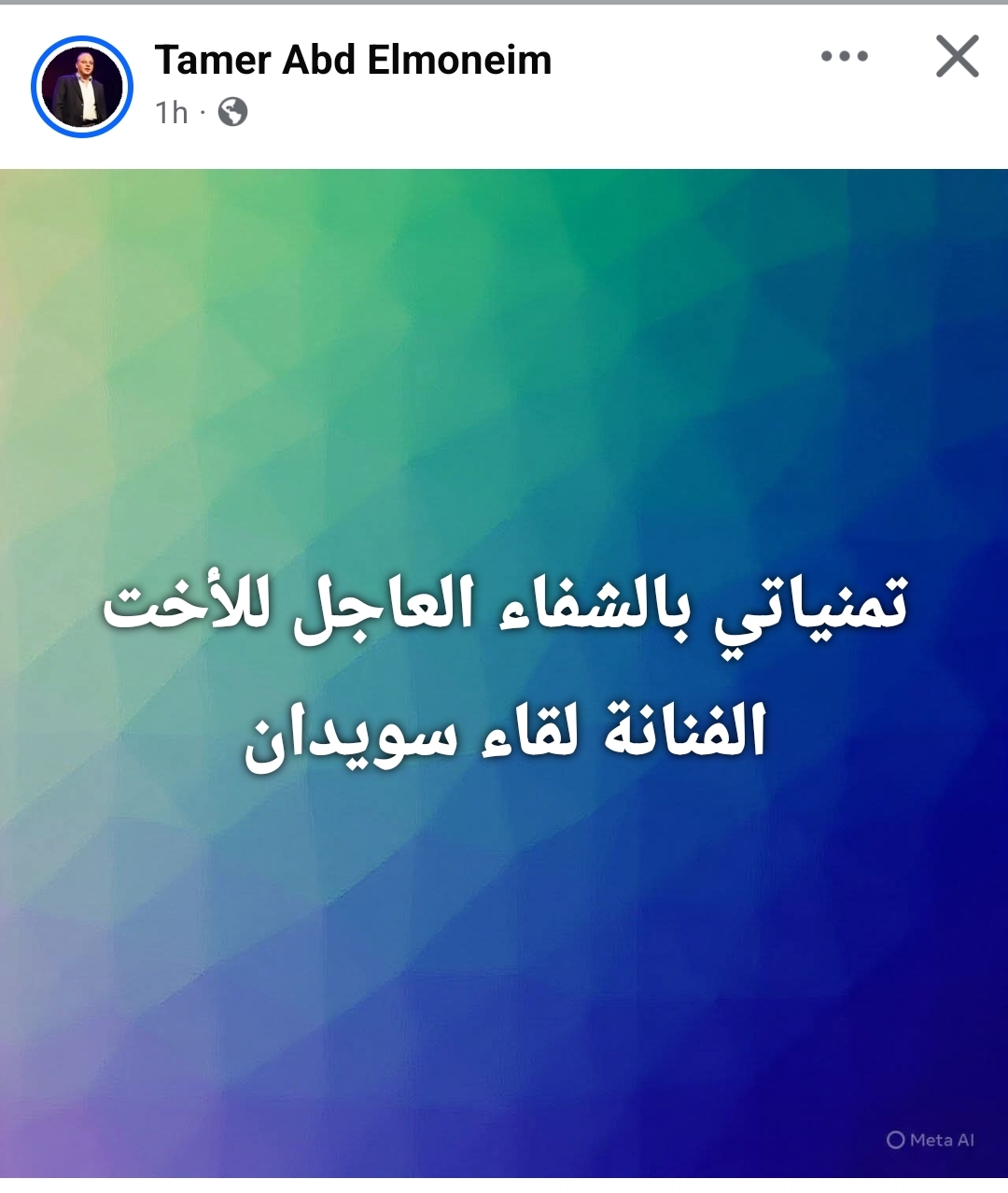 أعرب الفنان تامر عبدالمنعم عن تمنياته بالشفاء العاجل للفنانة لقاء سويدان، وذلك عبر منشور له على صفحته الرسمية بموقع فيسبوك، جاء فيه: «تمنياتي بالشفاء العاجل للأخت الفنانة لقاء سويدان».