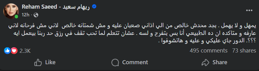 وكتبت ريهام سعيد: “يمهل و لا يهمل . بجد محدش خالص من اللي أذاني صعبان عليه و مش شمتانه خالص لأني مش فرحانه لأني عارفه و متاكده ان ده الطبيعي أنا بس بتفرج و لسه”.