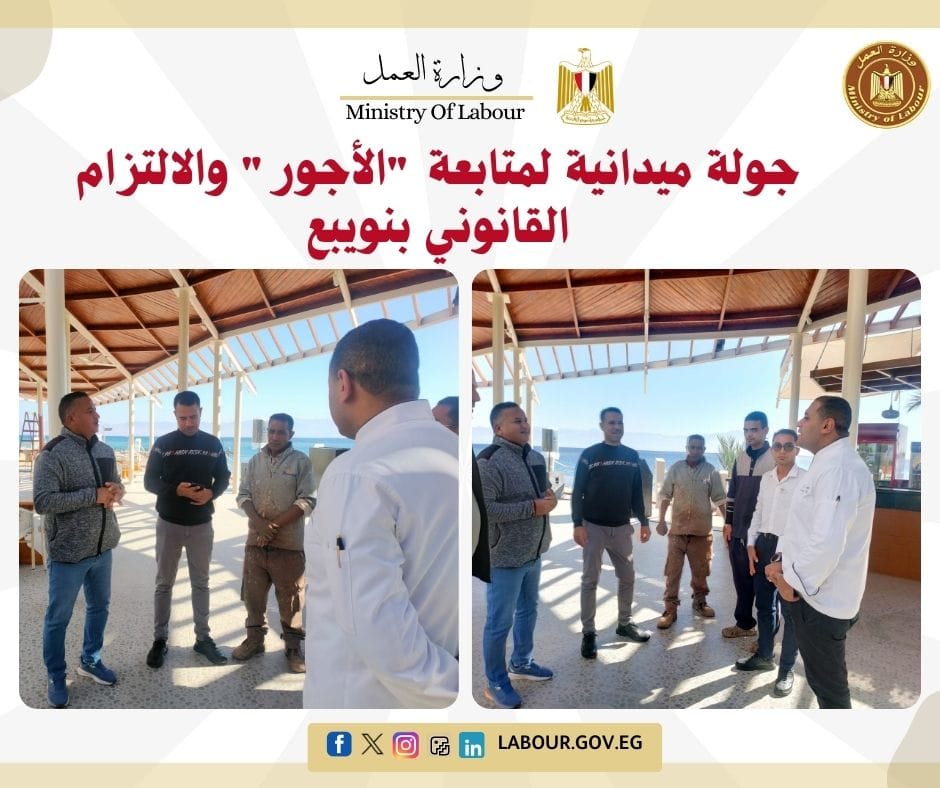 ونفذ مكتب عمل نويبع بجنوب سيناء جولة تفتيشية بفندق "ستراند طابا"، لمتابعة الالتزام بالحد الأدنى للأجور وأحكام قانون العمل الجديد رقم 14 لسنة 2025.