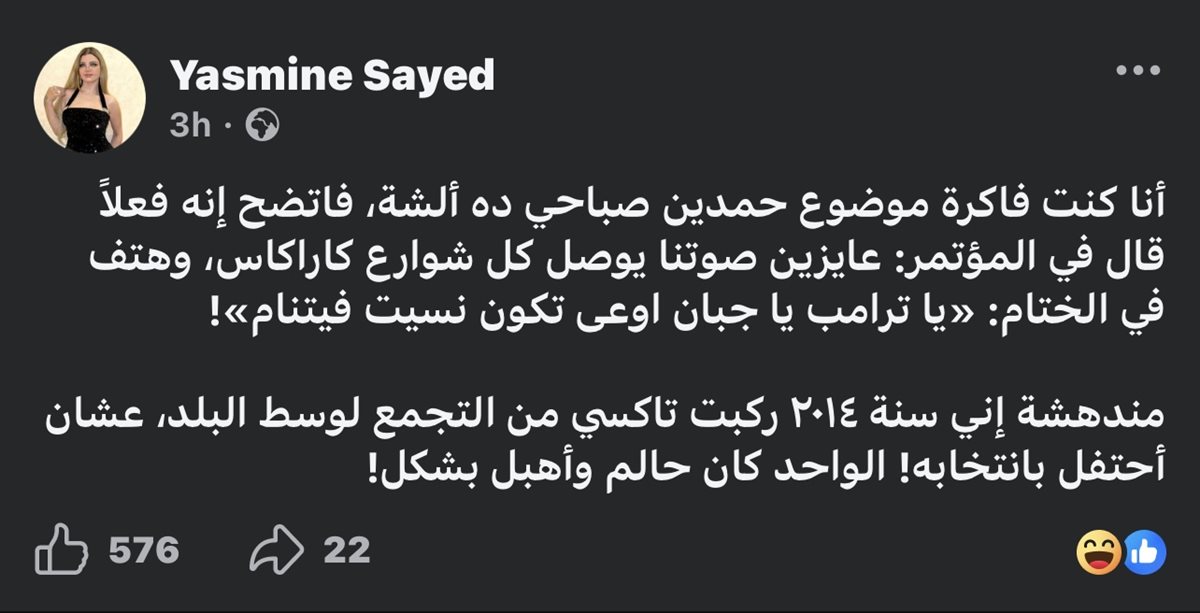 كتبت ياسمين الخطيب: "أنا كنت فاكرة موضوع حمدين صباحي ده ألشة، فاتضح إنه فعلاً قال في المؤتمر: عايزين صوتنا يوصل كل شوارع كاراكاس، وهتف في الختام: «يا ترامب يا جبان اوعى تكون نسيت فيتنام»!