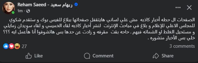 كتبت ريهام سعيد: “الصفحات اللي حاطة أخبار كاذبة مش على لساني هايتقفل صفحاتها ببلاغ للفيس بوك، وسأتقدم بشكوى للمجلس الأعلي للإعلام، وبلاغ في مباحث الإنترنت لنشر أخبار كاذبة”.