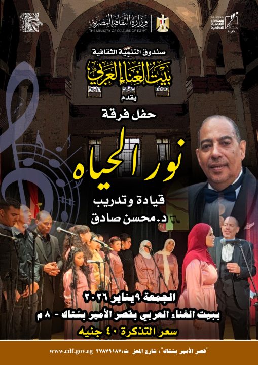 يحيي بيت الغناء العربي (قصر الأمير بشتاك) بشارع المعز، التابع لقطاع صندوق التنمية الثقافية، الليلة، حفلاً طربيًا جديدًا لفرقة “نور الحياة” من ذوي الهمم، في تمام الساعة الثامنة مساءً، تحت قيادة الفنان الدكتور محسن صادق.