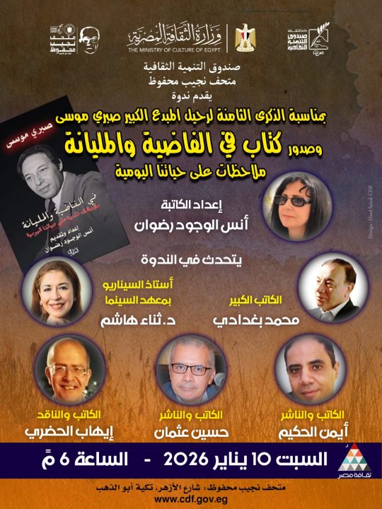 يقيم متحف ومركز إبداع نجيب محفوظ بتكية محمد أبو الدهب، التابع لصندوق التنمية الثقافية، غدًا السبت الموافق 10 يناير 2026، ندوة موسعة، بمشاركة نخبة من المثقفين والأدباء والشخصيات العامة، بمناسبة الذكرى الثامنة لرحيل المبدع الكبير صبري موسى، وبالتزامن مع صدور كتاب “في الفاضية والمليانة.. ملاحظات على حياتنا اليومية”، وذلك في تمام الساعة السادسة مساءً.
