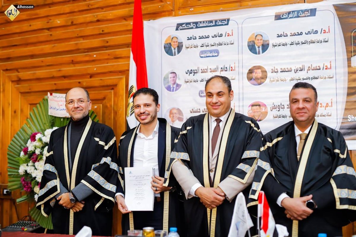 بينما ترأس لجنة المناقشة والحكم الدكتور هاني محمد حامد، والدكتور حاتم السيد أحمد الجوهري (مناقشًا داخليًا)، والدكتور محمد مصطفى حسني أستاذ جراحة العظام بطب طنطا (مناقشًا خارجيًا).