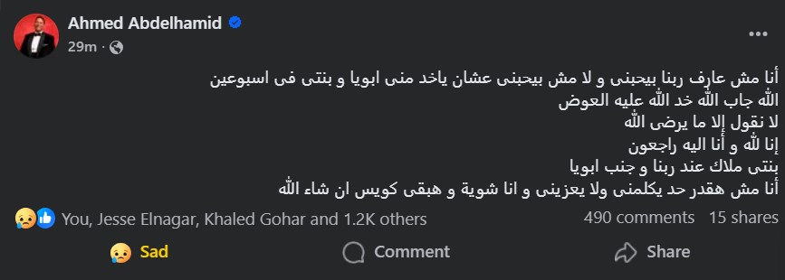 - أحمد عبد الحميد يعلن عن وفاة ابنته