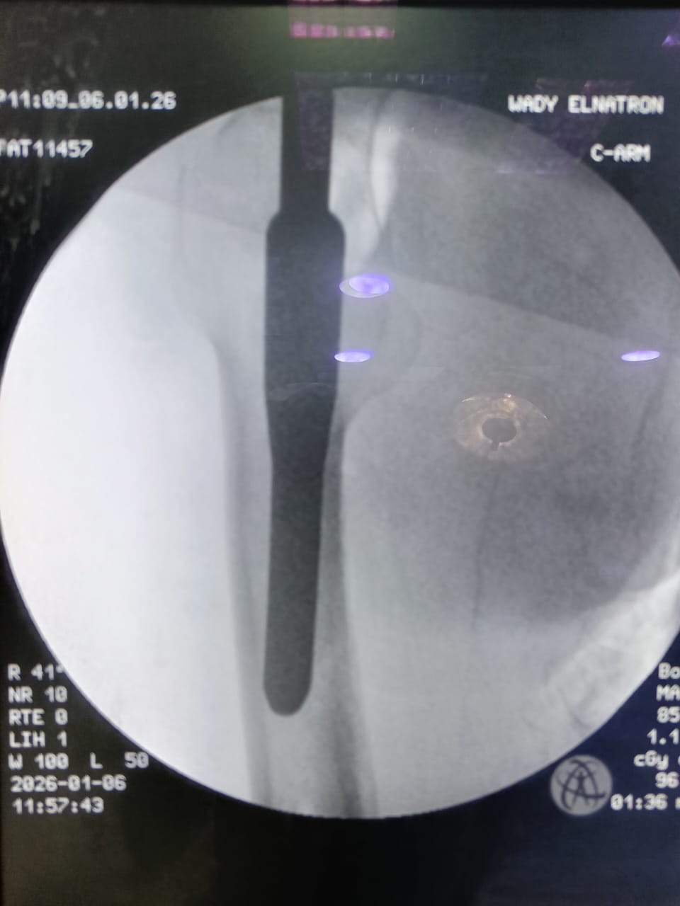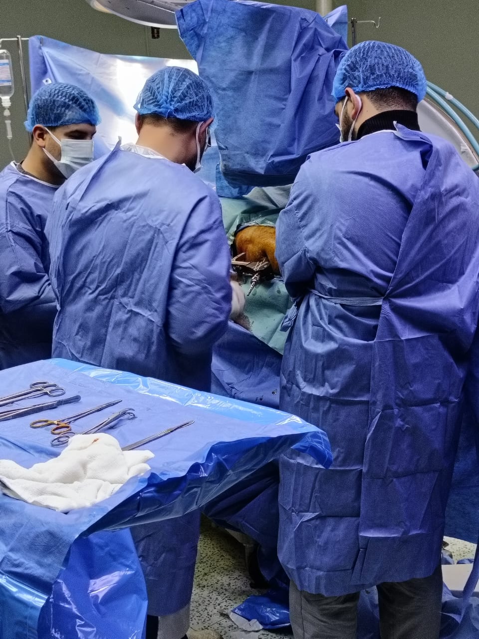 وعقب استقبال الحالة، تم إجراء التقييم الإكلينيكي الشامل والفحوصات الطبية اللازمة، وعلى ضوء النتائج تقرر التدخل الجراحي العاجل، حيث تم إجراء رد مغلق وتثبيت لكسر أعلى الفخذ الأيمن بين المدورين باستخدام مسمار نخاعي تشابكي (جاما نيل) المخصص لمثل هذه الكسور، بما يحقق ثباتًا جيدًا للكسر، ويساهم في سرعة التعافي وتقليل فرص حدوث المضاعفات.