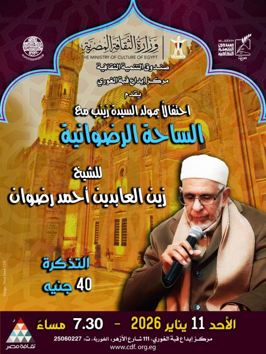 يستضيف مركز إبداع قبة الغوري بالازهر، التابع لقطاع صندوق التنمية الثقافية، مساء غد الأحد الموافق 11 يناير 2026، عرضًا للإنشاد الديني تحييه فرقة الساحة الرضوانية للشيخ زين العابدين بن أحمد رضوان، وذلك في تمام الساعة السابعة والنصف مساءً، احتفالًا بمولد السيدة زينب رضي الله عنها.