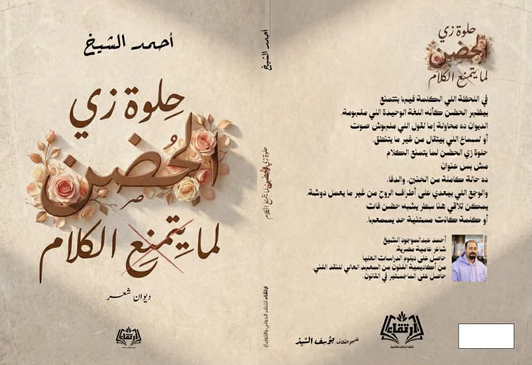 صدر حديثا للشاعر أحمد الشيخ، ديوان «حلوة زي الحضن لما يتمنع الكلام» وهو ديوان شعر بالعامية المصرية، عن دار ارتقاء للنشر والتوزيع الدولي، ويشارك في الدورة السابعة والخمسين من معرض القاهرة الدولي للكتاب 2026.