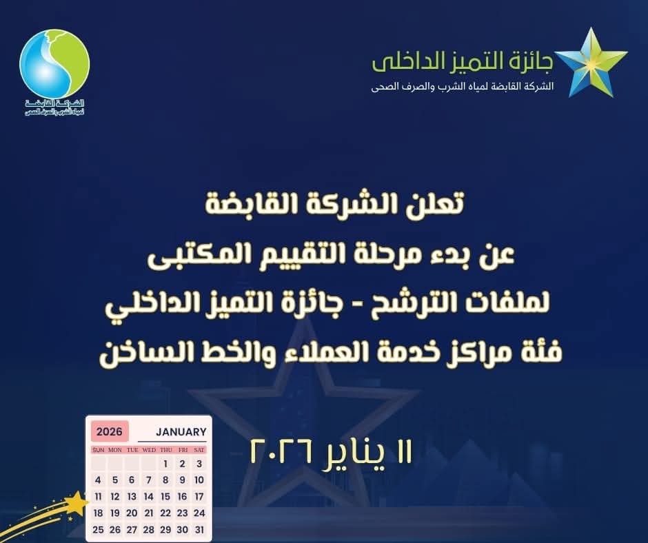 أعلنت الشركة القابضة لمياه الشرب والصرف الصحي بدء مرحلة التقييم التمهيدية (المكتبية) لجائزة التميز الداخلي في مجالي خدمة العملاء والخط الساخن.