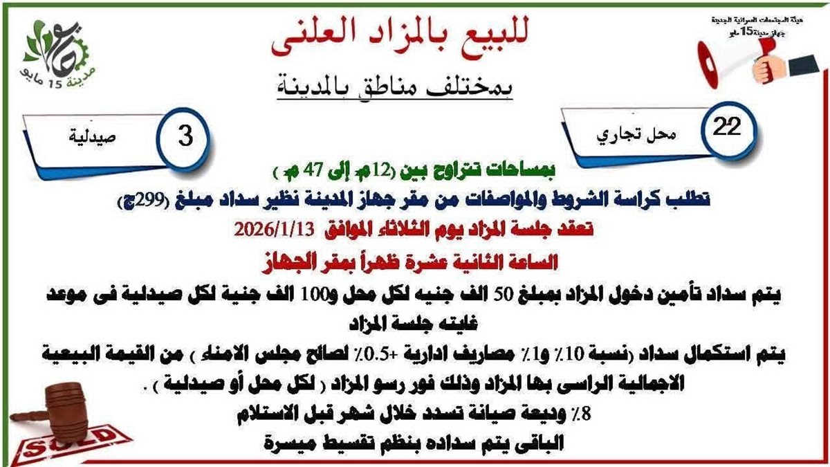 ومن المقرر عقد جلسة المزاد يوم الثلاثاء الموافق 13 يناير الجاري، في تمام الساعة الثانية عشرة ظهراً بمقر جهاز مدينة 15 مايو.