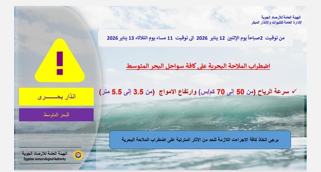 أطلقت الهيئة العامة للأرصاد الجوية، إنذارًا بحريًا بدأ من الساعة الثانية صباحًا اليوم الإثنين ويستمر حتى الحادية عشر مساء غد الثلاثاء، محذرة من اضطراب حركة الملاحة البحرية على كافة سواحل البحر المتوسط.