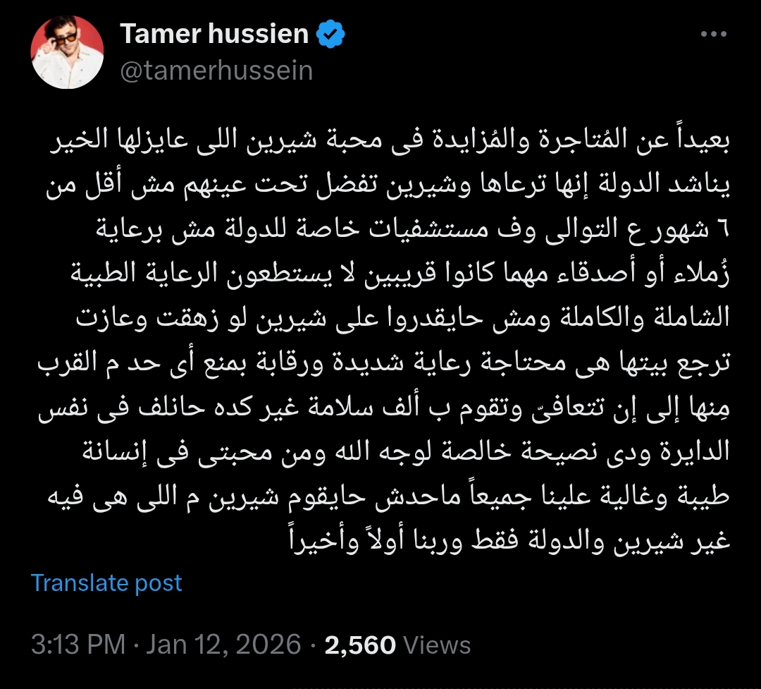 وقال تامر حسين، في منشور له عبر حسابه الرسمي على موقع «إكس»، إن شيرين تحتاج إلى رعاية طبية متواصلة لا تقل عن ستة شهور، داخل مستشفيات خاصة تابعة للدولة، مشدداً على أن هذه الرعاية يجب ألا تكون تحت إشراف زملاء أو أصدقاء، مهما كانت درجة قربهم منها، لعدم قدرتهم على تقديم الرعاية الطبية الشاملة اللازمة.