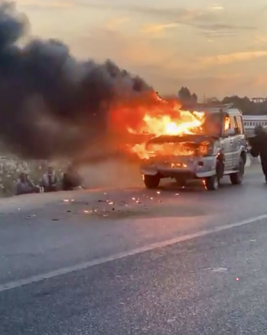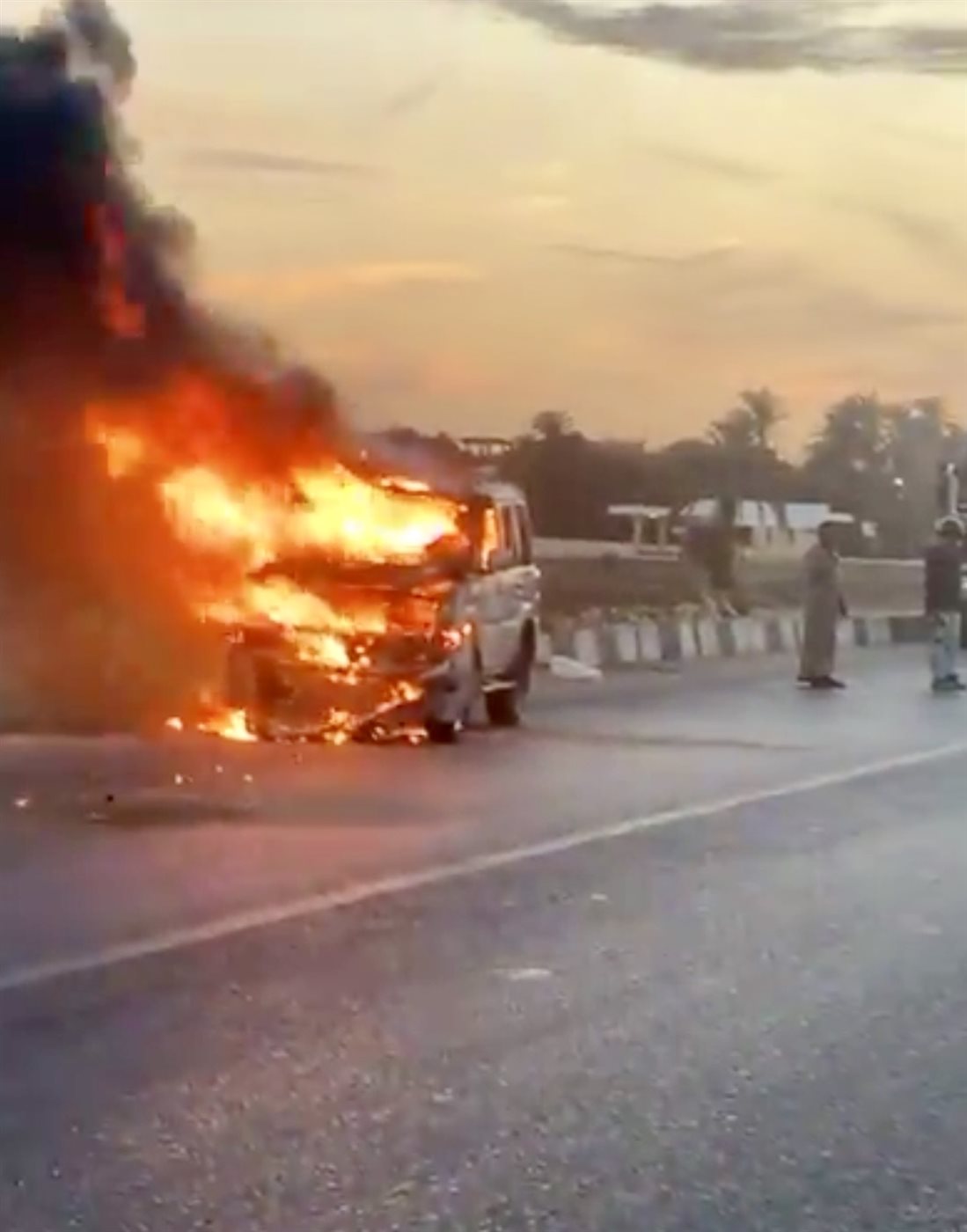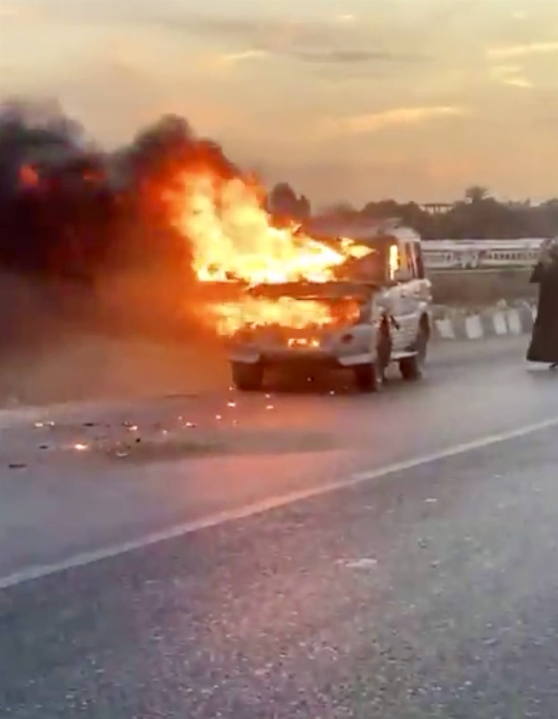 شهدت منطقة الحادث خللا فنيا مفاجئا في ضفيرة الكهرباء الخاصة بالمركبة مما أدى لنشوب حريق تفحم سيارة الطود المروع خلال سيرها بشكل طبيعي، وتسببت شرارة كهربائية ناتجة عن الخلل في تصاعد ألسنة لهب كثيفة من المحرك لتمتد بسرعة البرق إلى باقي أجزاء السيارة ومقصورتها الداخلية.