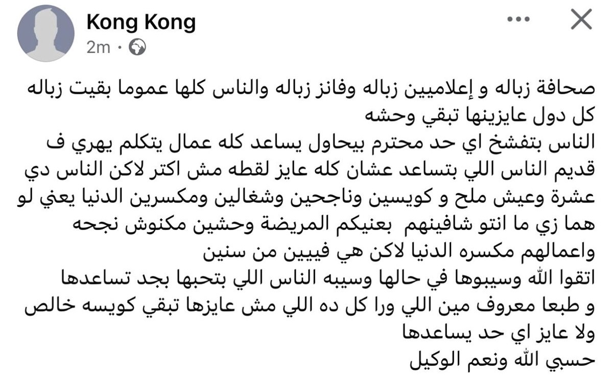 وأردف: “اتقوا اللّه وسيبوها في حالها وسيبوا الناس اللي بتحبها بجد تساعدها وطبعا معروف مين اللي ورا كل ده اللي مش عايزها تبقى كويسة خالص ولا عايز أي حد يساعدها"، مختتمًا بقوله: "حسبي اللّٰه ونعم الوكيل”.