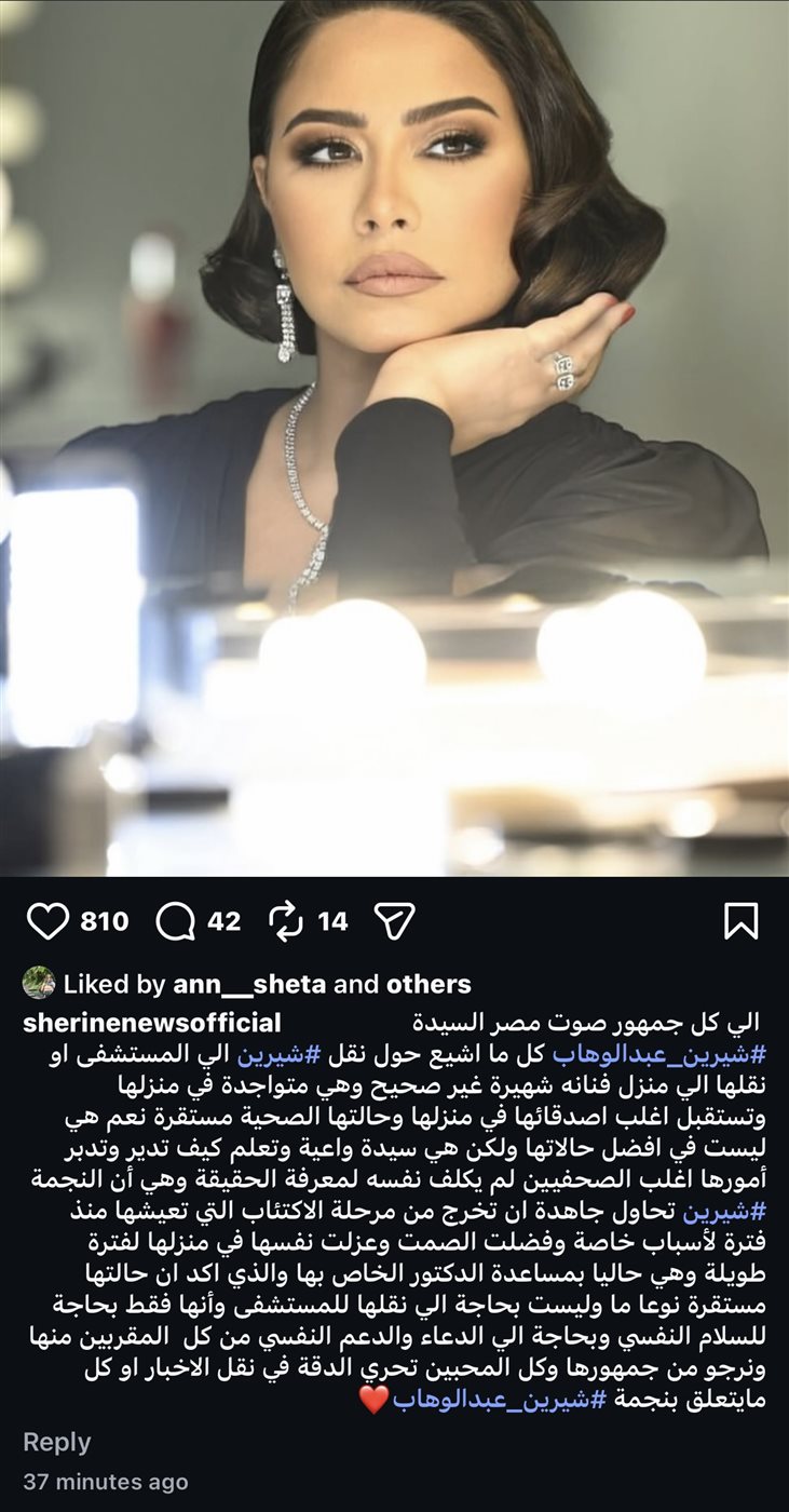 وفي بيان توضيحي آخر، نشرت الصفحة الرسمية للمطربة شيرين عبد الوهاب بيانًا توضيحيًا يحسم الجدل حول كل ما تردد عنها خلال الأيام القليلة الماضية بشأن تدهور حالتها الصحية والنفسية، وانتقالها لمنزل صديقتها ياسمين رضا شقيقة النجمة زينة.
