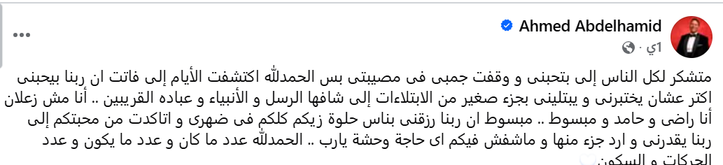 ونشر أحمد عبد الحميد عبر حسابه على فيسبوك رسالة مؤثرة قال فيها: "متشكر لكل الناس إلى بتحبني ووقفت جنبي في مصيبتي، الحمدلله اكتشفت الأيام اللي فاتت إن ربنا بيحبني اكتر عشان يختبرني ويبتليني بجزء صغير من الابتلاءات اللي شافها الرسل والأنبياء وعباده القريبين".