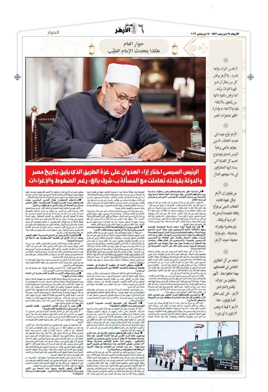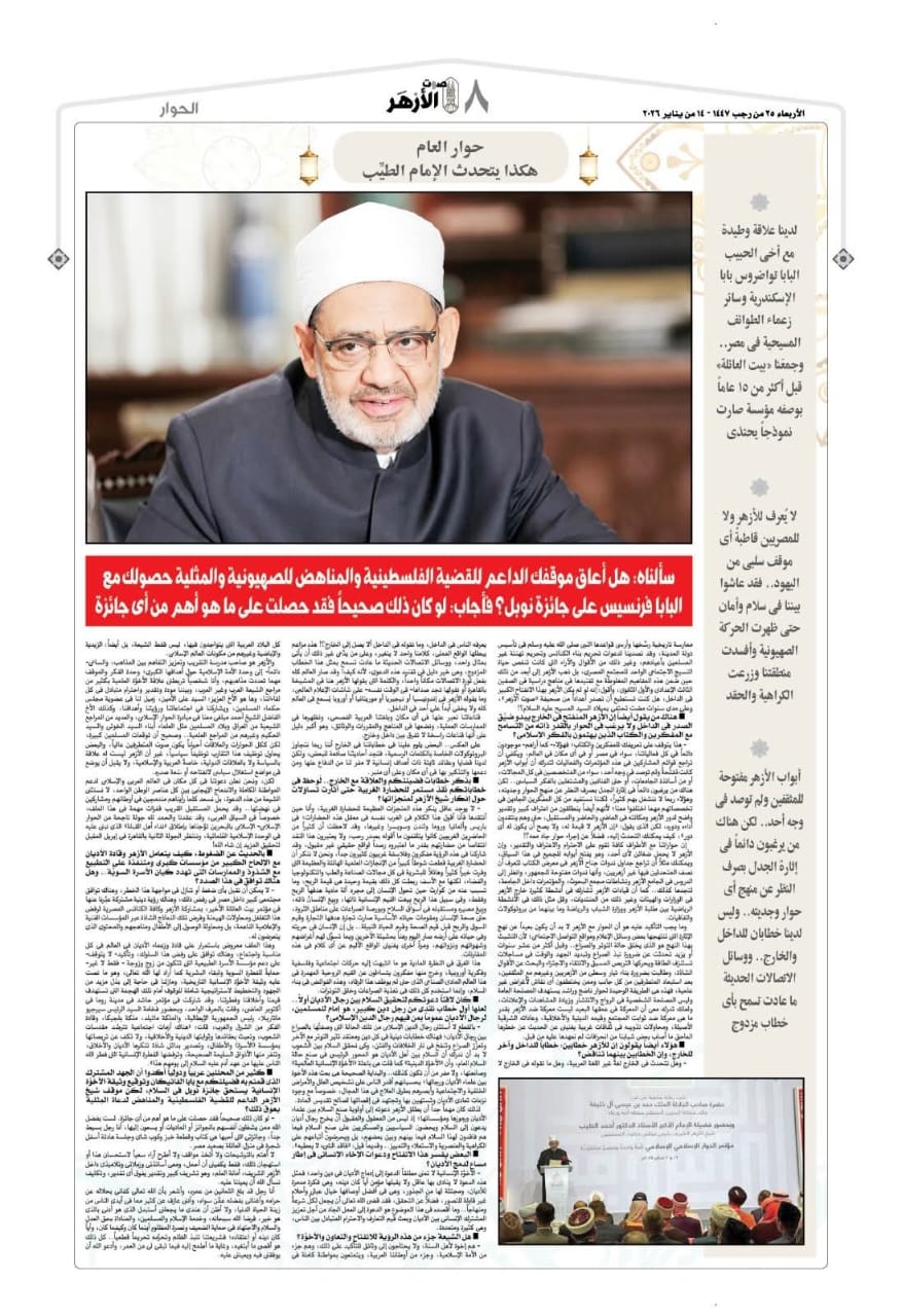 أجرت جريدة «صوت الأزهر» حوارًا صحفيًا مهمًا مع الإمام الأكبر الأستاذ الدكتور أحمد الطيب، شيخ الأزهر الشريف، وذلك بمناسبة بلوغ فضيلته عامه الثمانين، في حوار وصفته الجريدة بـ«حوار العام»، لما تضمنه من مواقف واضحة، ورؤى فكرية وإنسانية عميقة، عكست ثوابت الأزهر ودوره الوطني والإنساني.