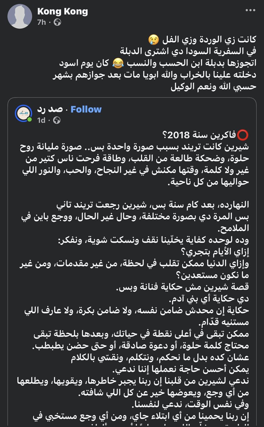 كتب شقيق شيرين عبد الوهاب: "الاستاذ نقيب الموسيقيين و الاستاذ نقيب الممثلين هو ليه حضرتكم مبتظهروش في الصورة غير لما يكون في حاجه يعني ليه مش بتسألوا عليها في الايام العادية طالما امرها يهمكم اوى كده خلاص بقي كفايه متاجره ارحموها بقي".