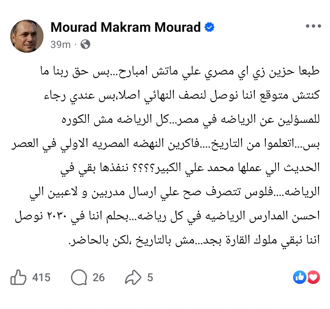 وقال مكرم، عبر حسابه الشخصي على موقع «فيسبوك»، إن مشاعر الحزن طبيعية «زي أي مصري»، لكنه شدد على أن المشكلة الحقيقية لا تتعلق بمباراة أو بطولة بعينها، بل بمنظومة الرياضة في مصر بشكل عام.