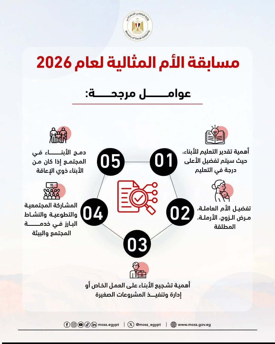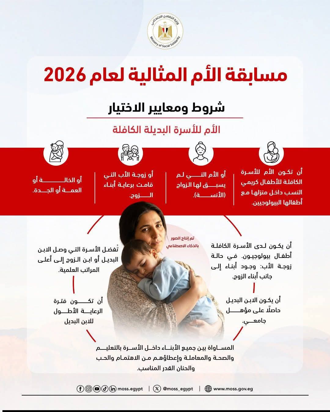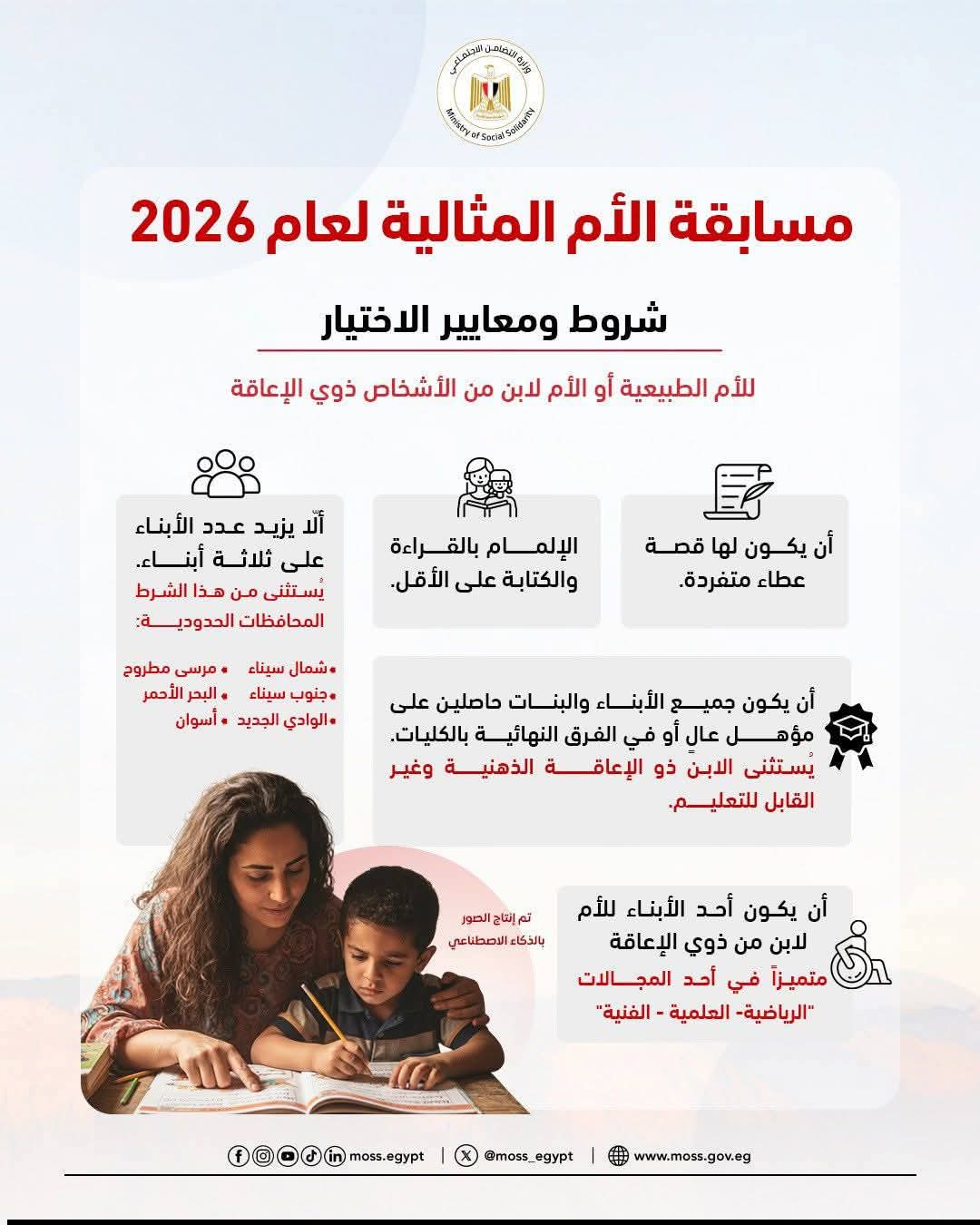 أعلنت مديرية التضامن الاجتماعي بمحافظة سوهاج، عن فتح باب التقدم للإشتراك في مسابقة الأم المثالية لعام 2026، وذلك تحت رعاية وزارة التضامن الاجتماعي، بتوجيهات اللواء دكتور عبد الفتاح سراج محافظ الإقليم، وذلك نظرًا لاقتراب موعد الاحتفال السنوي بـعيد الأم في مارس 2026، وما يمثله ذلك من معاني سامية للتقدير والاحترام لدور الأم داخل المجتمع المصري، .
