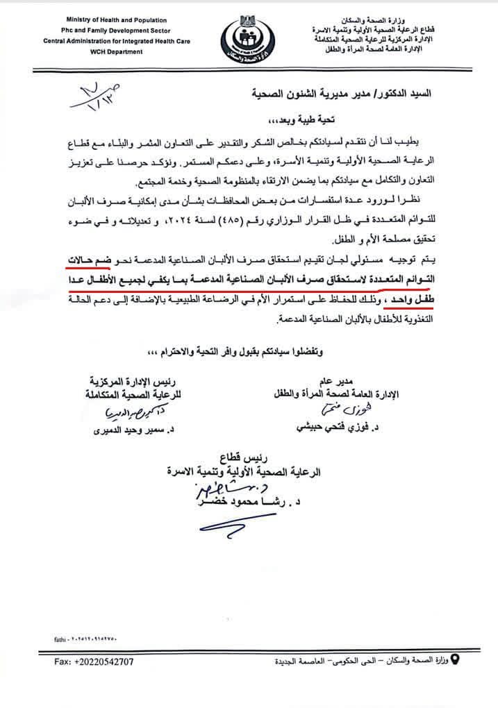 وأضأف: “نظرا لورود عدة استفسارات من بعض المحافظات بشأن مدى إمكانية صرف الألبان للتوائم المتعددة في ظل القرار الوزاري رقم (٤٨٥) لسنة ۲۰۲٤ ، وتعديلاته وفي ضوء تحقيق مصلحة الأم و الطفل”.