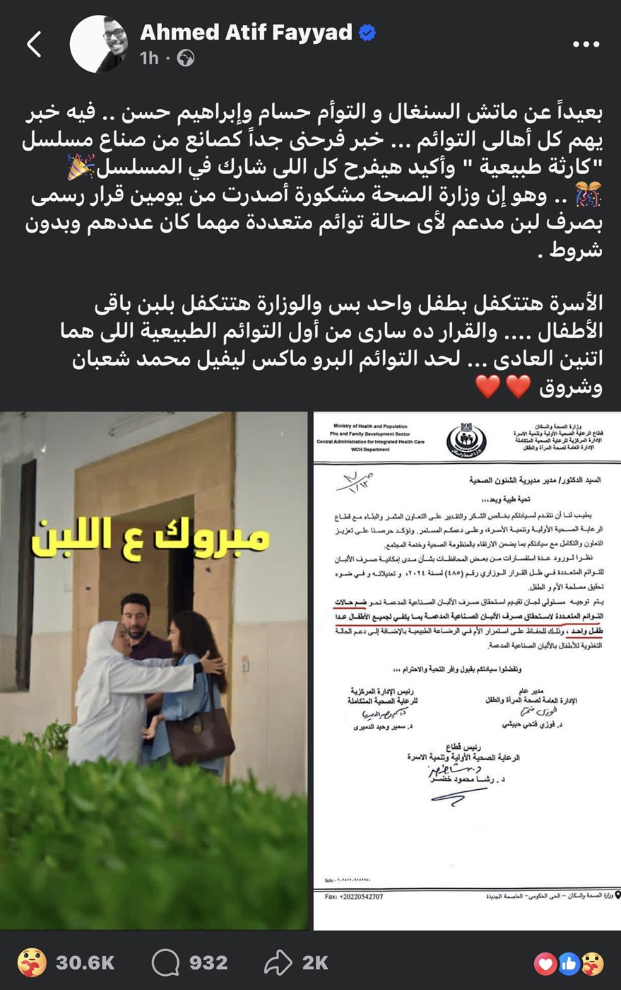 وتابع: “وهو إن وزارة الصحة مشكورة أصدرت من يومين قرار رسمى بصرف لبن مدعم لأى حالة توائم متعددة مهما كان عددهم وبدون شروط .. الأسرة هتتكفل بطفل واحد بس والوزارة هتتكفل بلبن باقى الأطفال .... والقرار ده سارى من أول التوائم الطبيعية اللى هما اتنين العادى ... لحد التوائم البرو ماكس ليفيل محمد شعبان وشروق”.