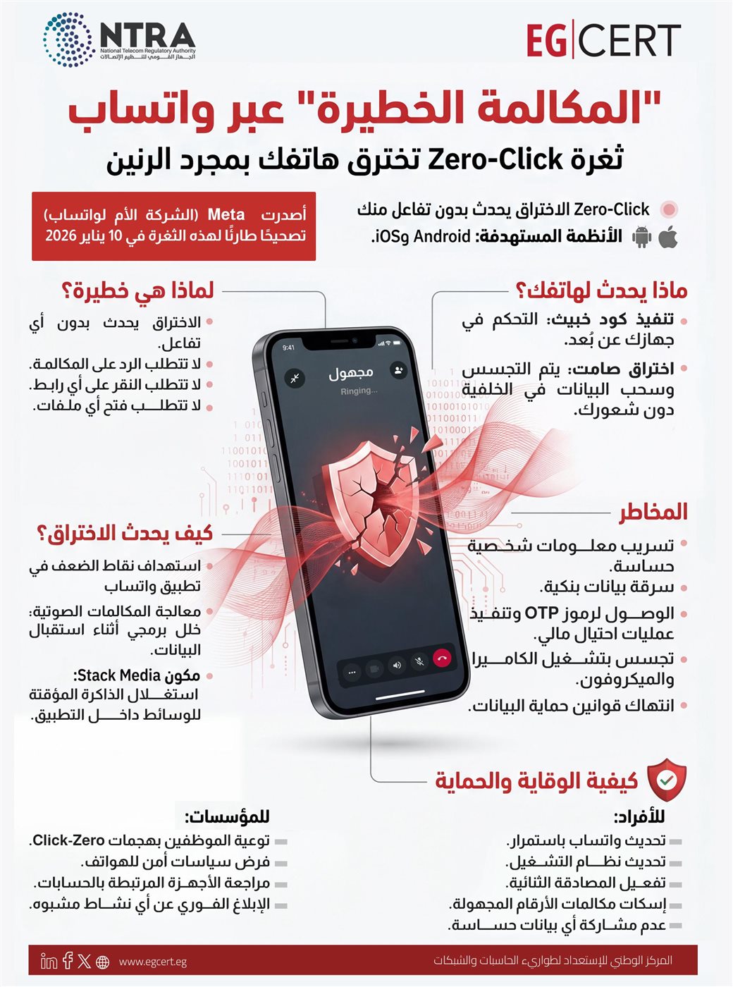 أطلق الجهاز القومي لتنظيم الاتصالات والمركز الوطني للاستعداد لطوارئ الحاسبات والشبكات (EG-CERT)، تحذيراً شديد اللهجة لمستخدمي الهواتف الذكية في مصر والمنطقة العربية، بشأن ثغرة أمنية حرجة في تطبيق "واتساب" تُعرف باسم "المكالمة الخطيرة".