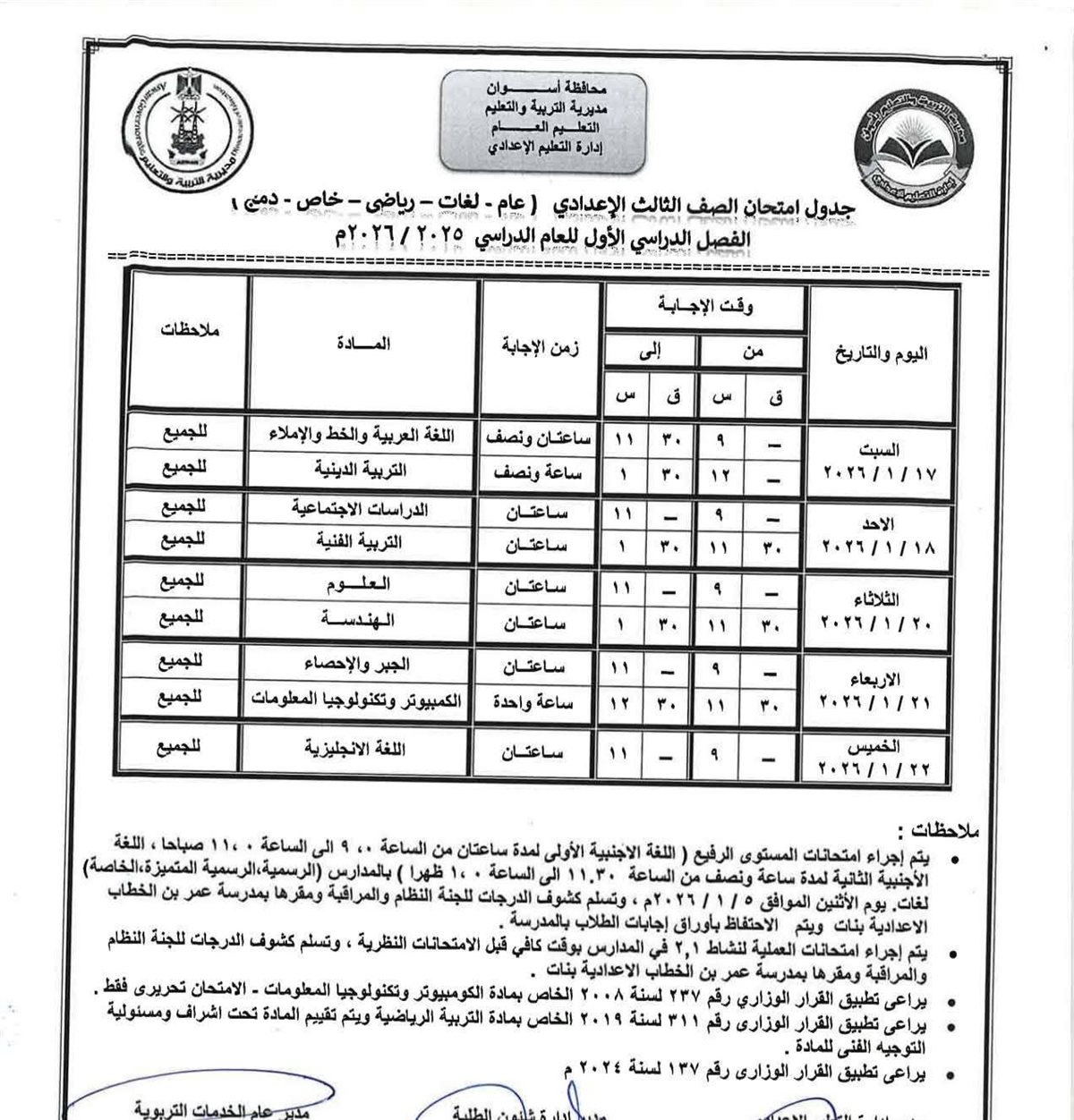 وجدير بالذكر أن طلاب الشهادة الإعدادية يؤدون امتحانهم غدًا فى مادتي "اللغة العربية والخط والإملاء" و "التربية الدينية" وتنتهى الامتحانات الخميس الموافق ٢٢ يناير الجارِ بمادة "اللغة الإنجليزية"، وتنطلق الامتحانات فى تمام الساعة التاسعة صباحًا.