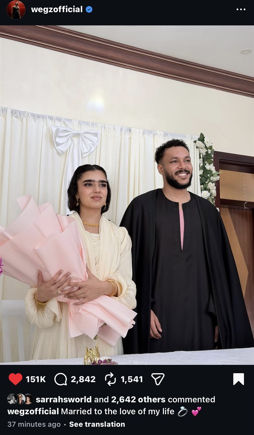 نشر ويجز صورته مرتديًا بدلة كلاسيك باللون الأسود وهو يرفع إصبعه بعد ختم عقد القران في إشارة منه لإعلان زواجه، على أغنية شيرين عبدالوهاب “حبه جنة”.