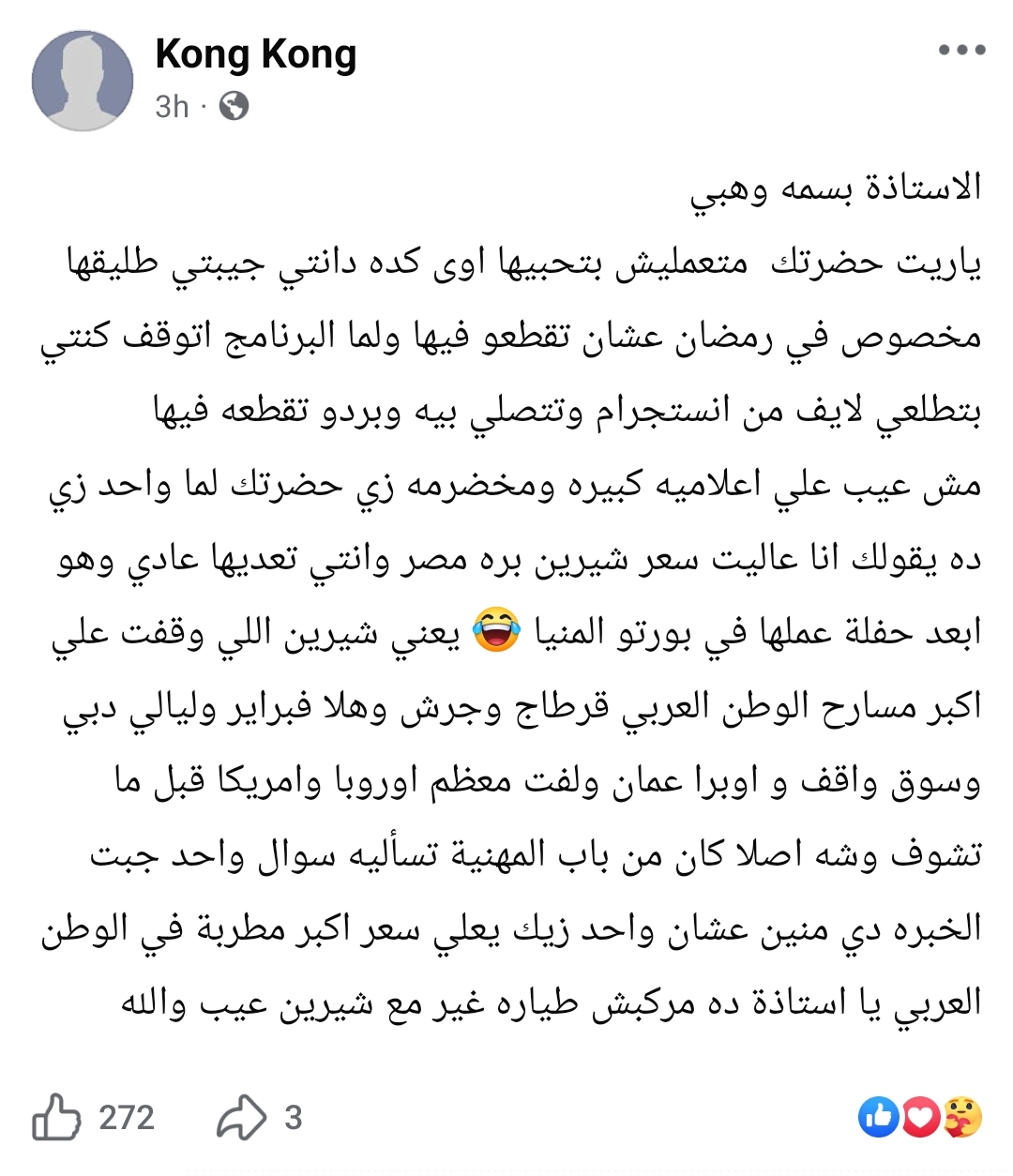 وأضاف أن ما وصفه بـ"التجاوز" لا يليق بإعلامية كبيرة ومخضرمة، خاصة بعد مرور تصريحات دون تعليق أو تصحيح، من بينها ادعاء طليق شيرين أنه ساهم في رفع أجرها خارج مصر، وهو ما اعتبره شفيق أمرًا غير منطقي.