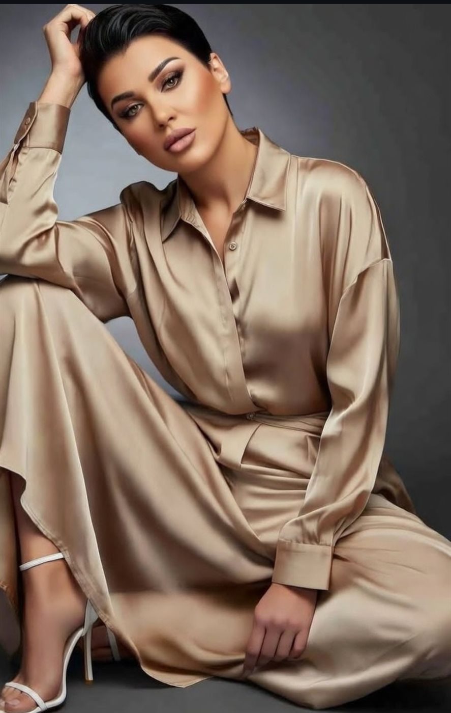 وبدت نادين الراسي بإطلالة جذابة، مرتديه فستانا طويلا فضفاضا بأكمام طويلة، صمم من قماش الحرير الناعم باللون الذهبي، فيما انتعلت صندلا بكعب عال.