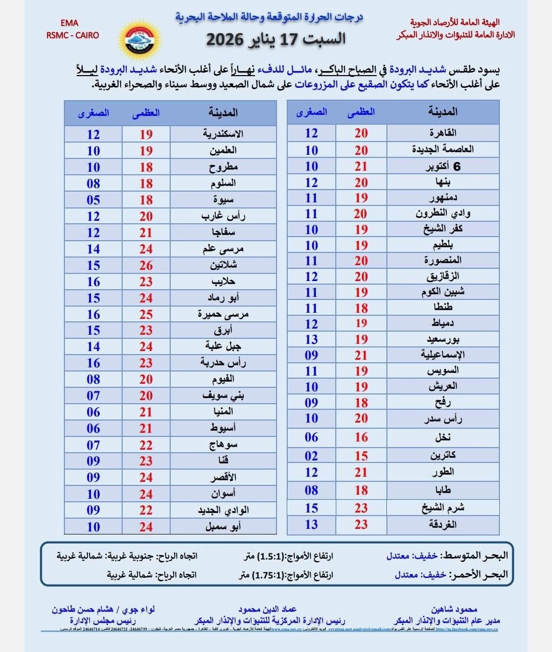 يشهد اليوم السبت الموافق 17 يناير، طقسًا شديد البرودة في الصباح الباكر ومائلًا للدفء على أغلب الانحاء وشديد البرودة في الليل وقد تصل درجة الحرارة في بعض المناطق إلى 5 و 2 درجة.