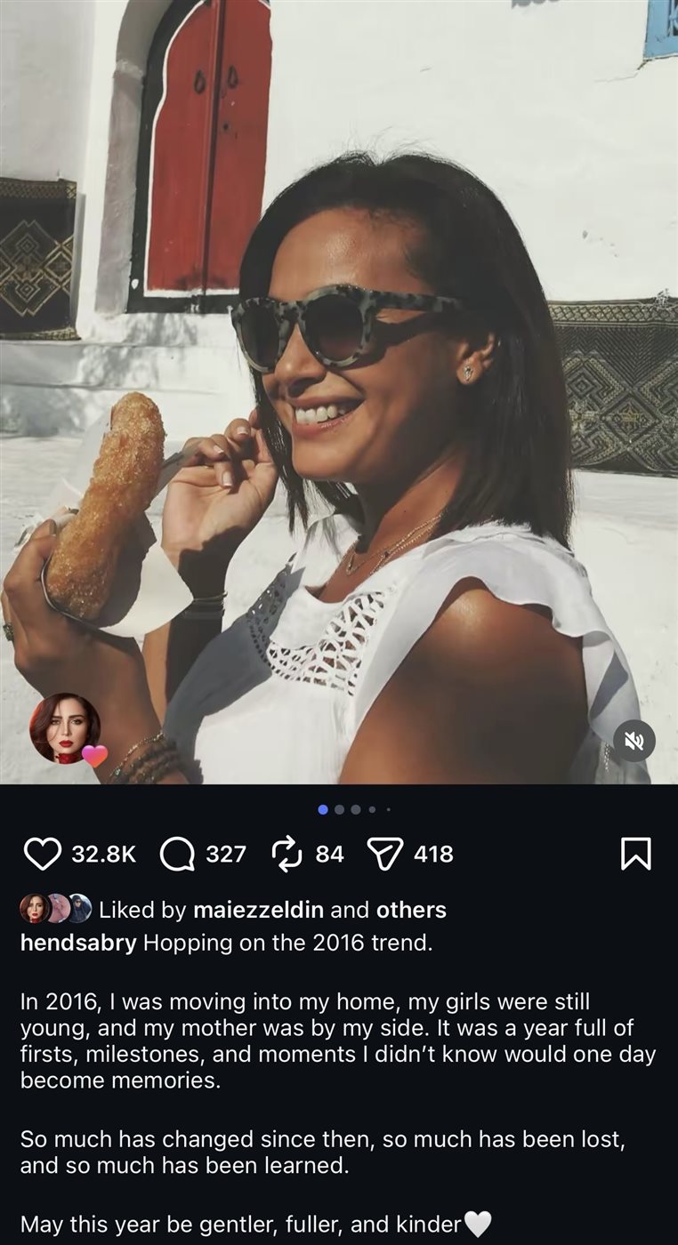 واختتمت هند صبري حديثها قائلة: "تغير الكثير منذ ذلك الحين، وفُقد الكثير، وتعلمنا الكثير، أتمنى أن يكون هذا العام ألطف، وأكمل، وأكثر رحمة".