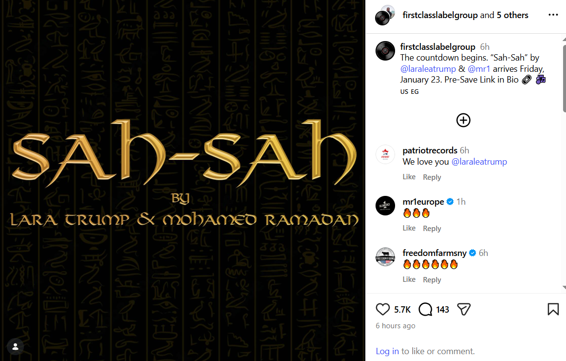 وكتب محمد رمضان في منشور عبر حسابه الرسمي بموقع تبادل الصور والفيديوهات الأشهر “إنستجرام”: "بدأ العد التنازلي، أغنية "صح صح" لـ"لارا ترامب ومحمد رمضان" ستصدر يوم الجمعة 23 يناير".