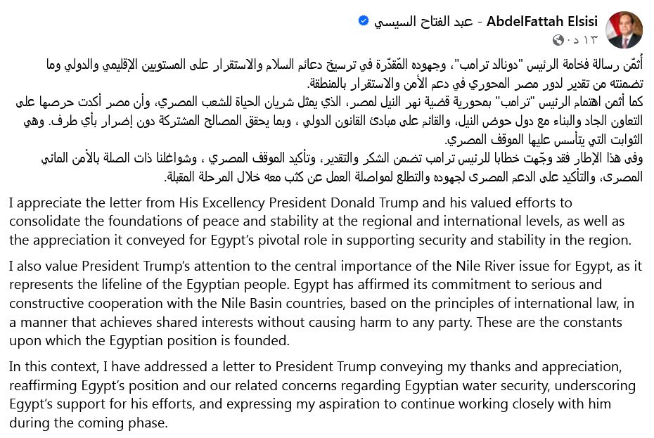 واستهل المنشور قائلًا: أُثمّن رسالة فخامة الرئيس "دونالد ترامب"، وجهوده المٌقدّرة في ترسيخ دعائم السلام والاستقرار على المستويين الإقليمي والدولي وما تضمنته من تقدير لدور مصر المحوري في دعم الأمن والاستقرار بالمنطقة.